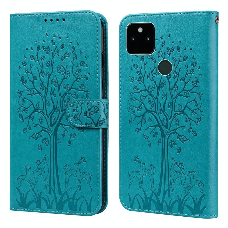 Για το Google Pixel 5a 5G Tree & Deer Pattern Pressed Printing Horizontal Flip Leather Phone Case (μπλε)