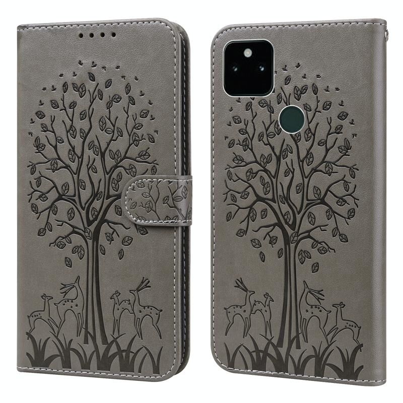 Για το Google Pixel 5a 5G Tree & Deer Pattern Pressed Printing Horizontal Flip Leather Phone Case (γκρι)