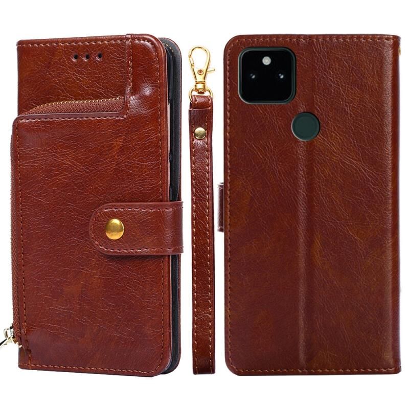 Για Google Pixel 5a 5G φερμουάρ τσάντα οριζόντια Flip δερμάτινη θήκη τηλεφώνου με υποδοχή & υποδοχές καρτών & κορδόνι (καφέ)