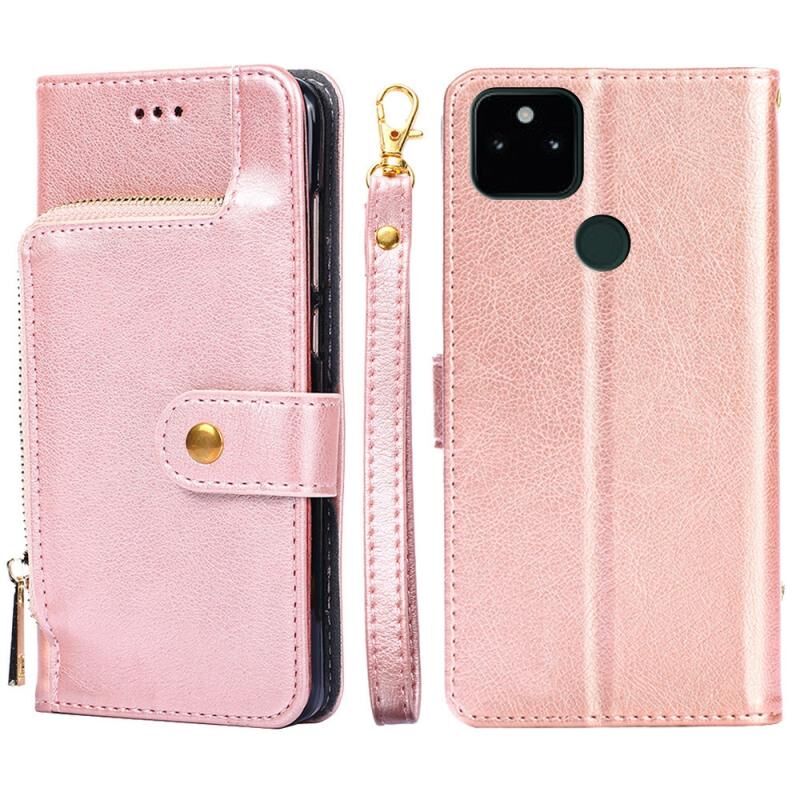 Για Google Pixel 5a 5G φερμουάρ τσάντα οριζόντια Flip δερμάτινη θήκη τηλεφώνου με υποδοχή & υποδοχές για κάρτες & κορδόνι (ροζ χρυσό)
