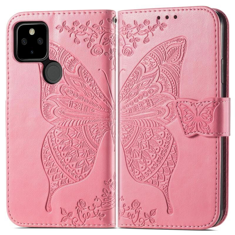 Για το Google Pixel 5A Πεταλούδα αγάπη λουλούδι ανάγλυφο οριζόντια Flip δερμάτινη θήκη με στήριγμα & υποδοχή κάρτας & πορτοφόλι & Lanyard (ροζ)