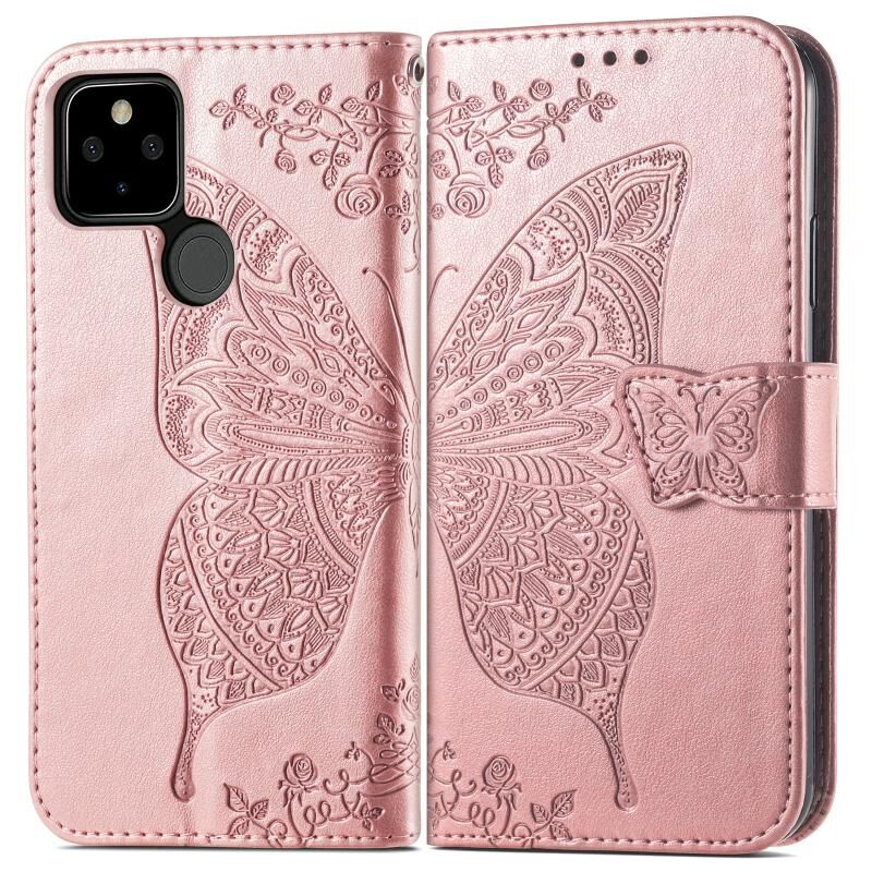 Για το Google Pixel 5A Πεταλούδα αγάπη λουλούδι ανάγλυφο οριζόντια Flip δερμάτινη θήκη με στήριγμα & υποδοχή κάρτας & πορτοφόλι & Lanyard (Rose Gold)