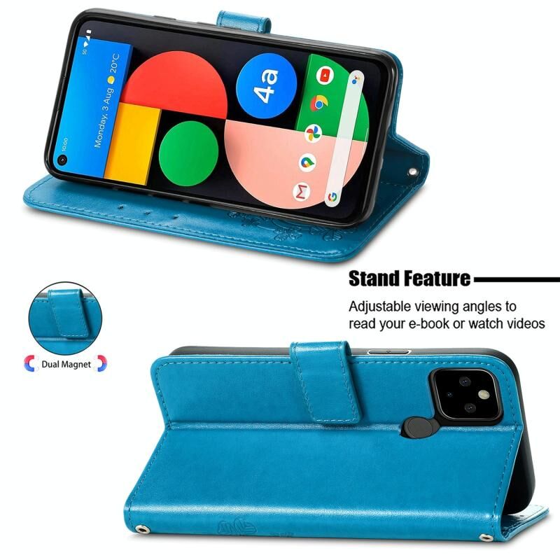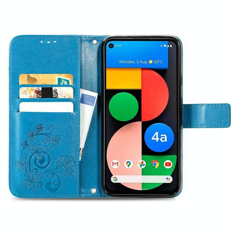 Για το Google Pixel 5A τετράφυλλο κούμπωμα ανάγλυφη αγκράφα Κινητό τηλέφωνο Προστασία Δερμάτινη θήκη με κορδόνι & υποδοχή κάρτας & πορτοφόλι & λειτουργία βραχίονα (μπλε)