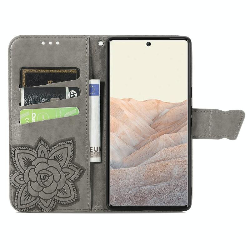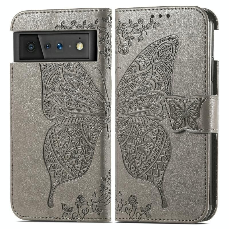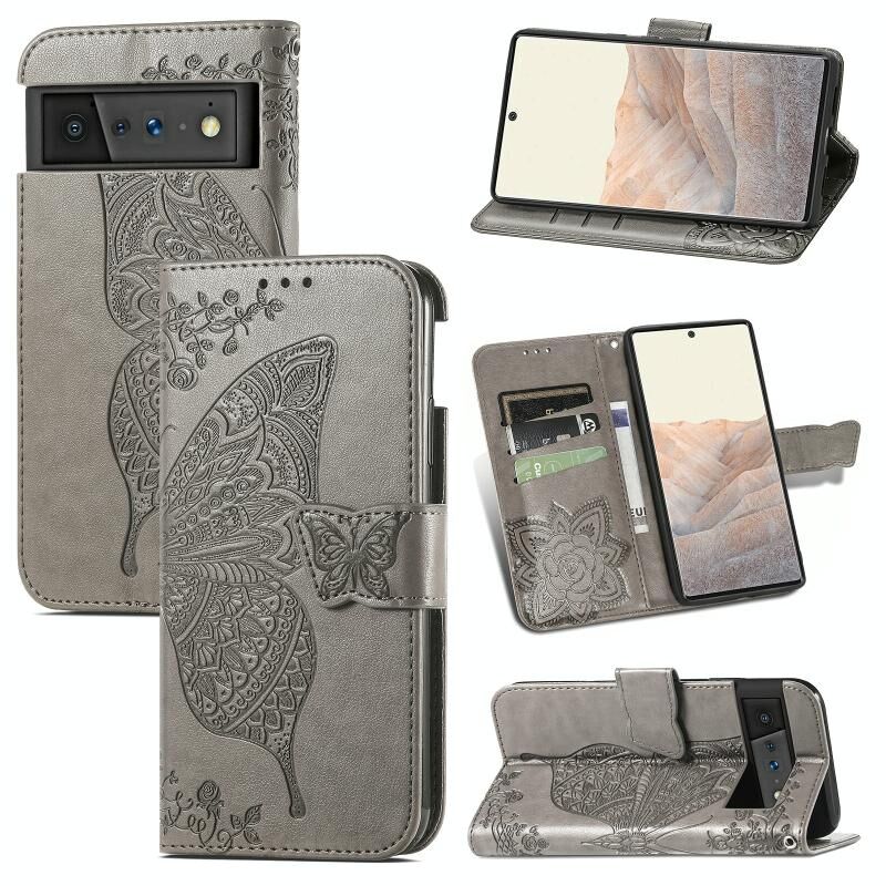 Για το Google Pixel 6 Πεταλούδα αγάπη λουλούδια ανάγλυφο οριζόντια Flip δερμάτινη θήκη με κάτοχο & υποδοχές για κάρτες & πορτοφόλι & κορδόνι (γκρι)