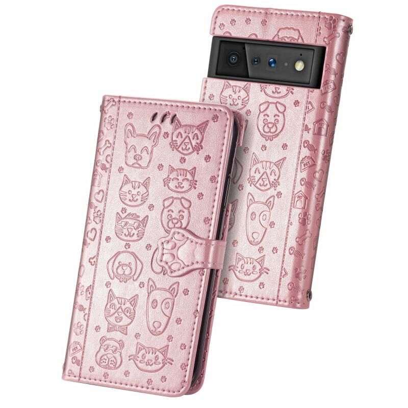 Για το Google Pixel 6 Cat and Dog Embossed Horizontal Flip Phone Leather Case με θήκη & υποδοχή κάρτας & πορτοφόλι & κορδόνι (ροζ χρυσό)