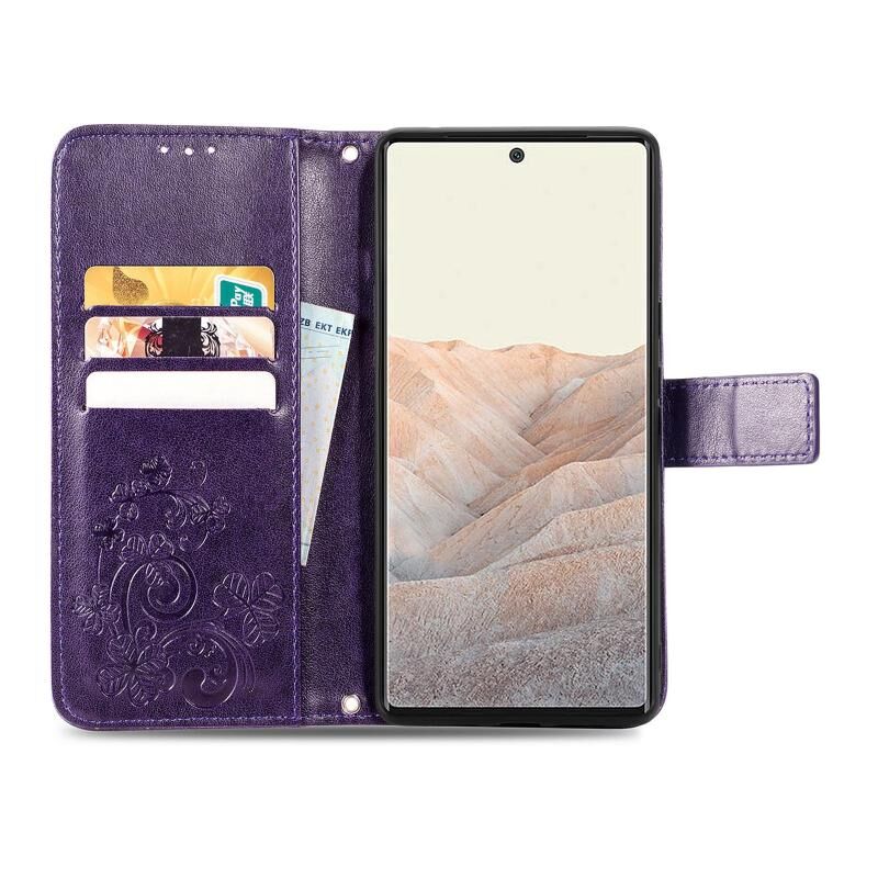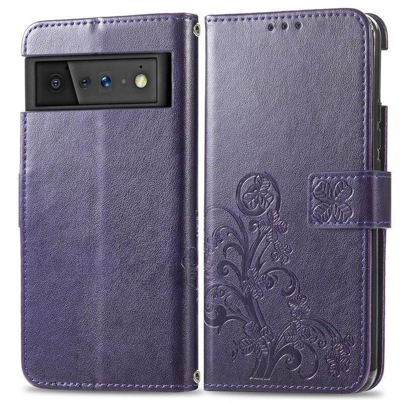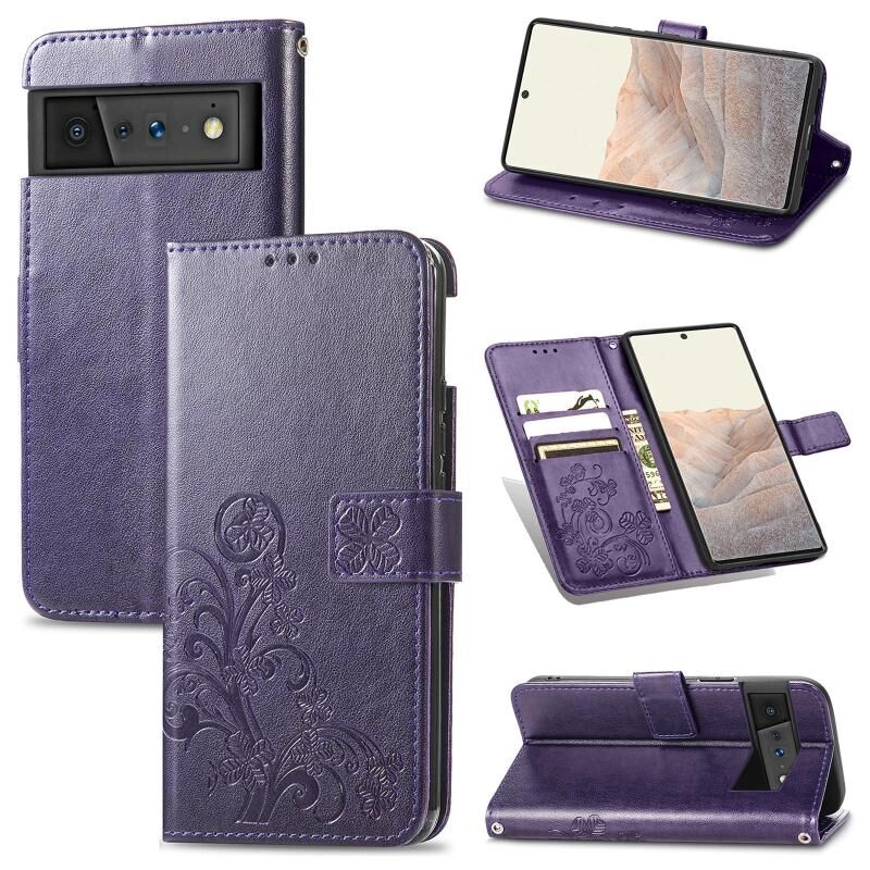 Για το Google Pixel 6 Four-leaf Clasp ανάγλυφη δερμάτινη θήκη με κορδόνι & υποδοχή κάρτας & πορτοφόλι & θήκη (μωβ)