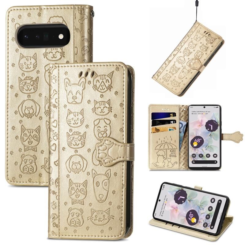 For Google Pixel 6 Pro Cat and Dog Embossed Leather Phone Case(Gold)
