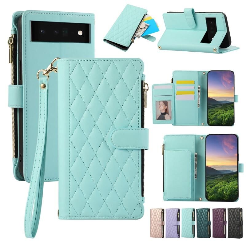 Για το Google Pixel 6 Pro Ρομβοειδές φερμουάρ πορτοφόλι δερμάτινη θήκη τηλεφώνου (κυανό)