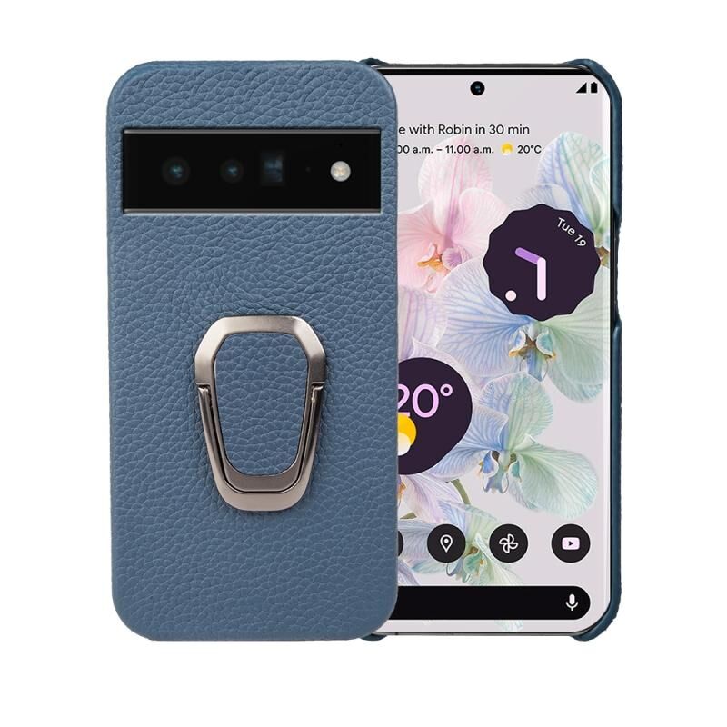 Θήκη τηλεφώνου από γνήσιο δέρμα με υφή λitchi για Google Pixel 6 Pro με δακτύλιο στήριξης (Λευκό)