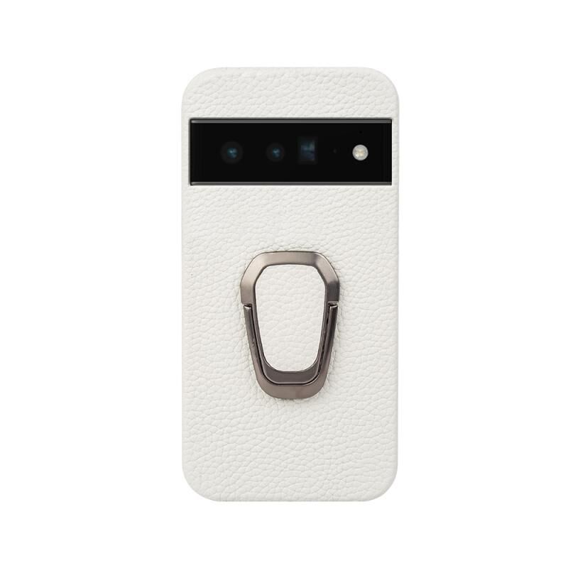 Θήκη τηλεφώνου από γνήσιο δέρμα με υφή λitchi για Google Pixel 6 Pro με δακτύλιο στήριξης (Λευκό)