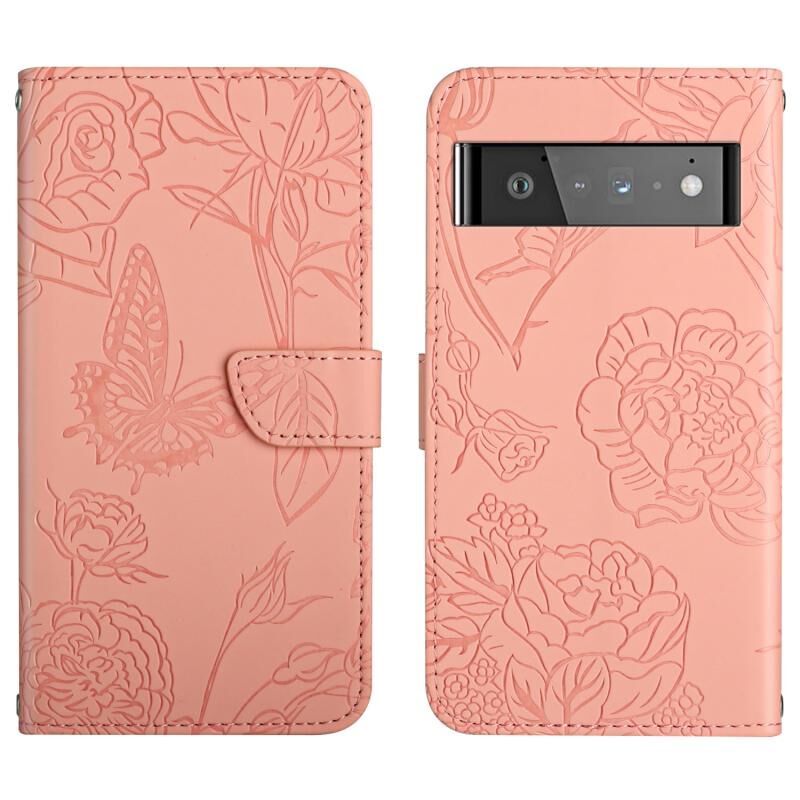 Θήκη τηλεφώνου από ανάγλυφο δέρμα για Google Pixel 6 Pro, αίσθηση δέρματος, σχέδιο πεταλούδας και παιωνίας (Κόκκινο)