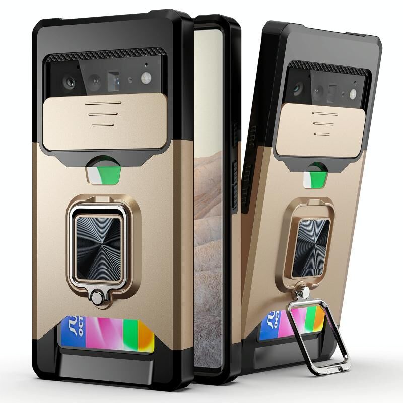 For Google Pixel 6 Pro Sliding Camera Cover Design PC + TPU Shockproof Case with Ring Holder & Card Slot(Gold)