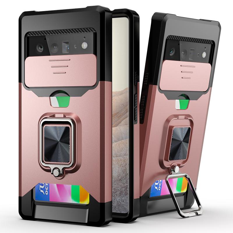 For Google Pixel 6 Pro Sliding Camera Cover Design PC + TPU Shockproof Case with Ring Holder & Card Slot(Rose Gold)