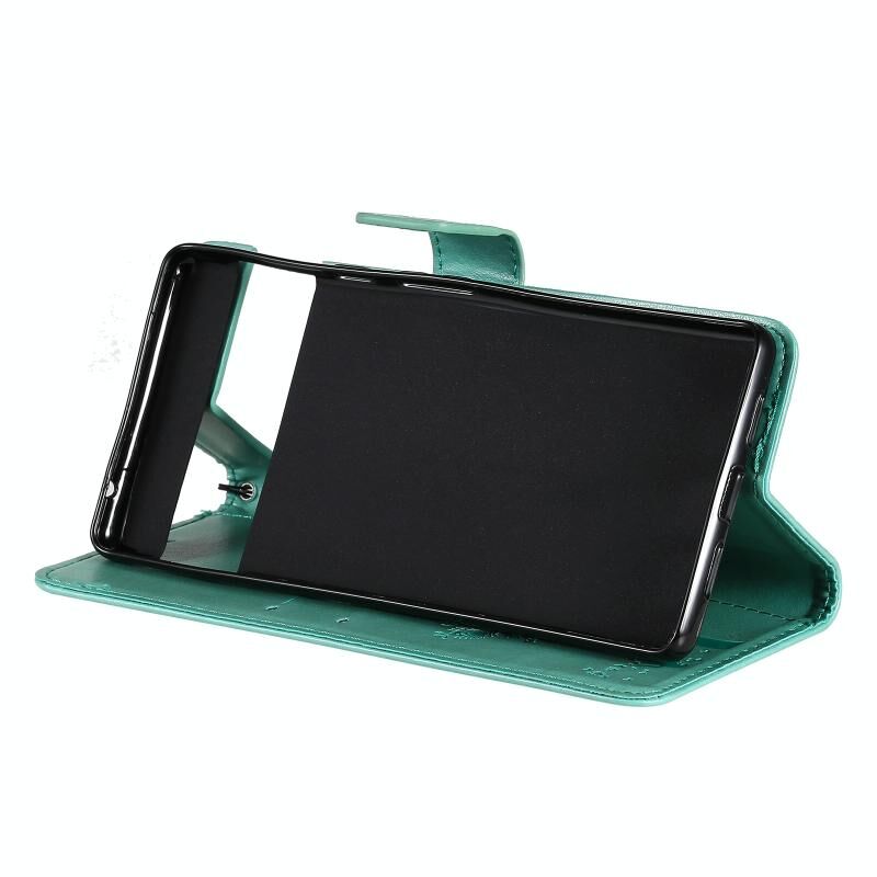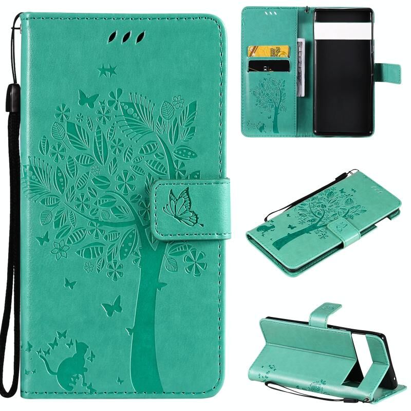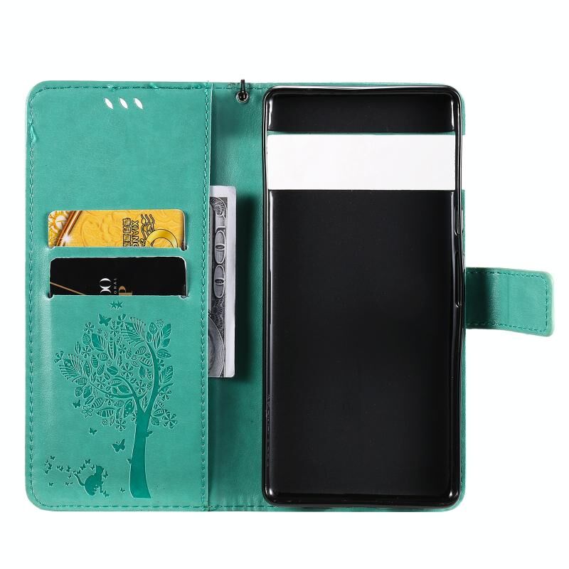 Για το Google Pixel 6 Pro Tree & Cat ανάγλυφο μοτίβο οριζόντια Flip δερμάτινη θήκη με θήκη & υποδοχές για κάρτες & πορτοφόλι & κορδόνι (πράσινο)