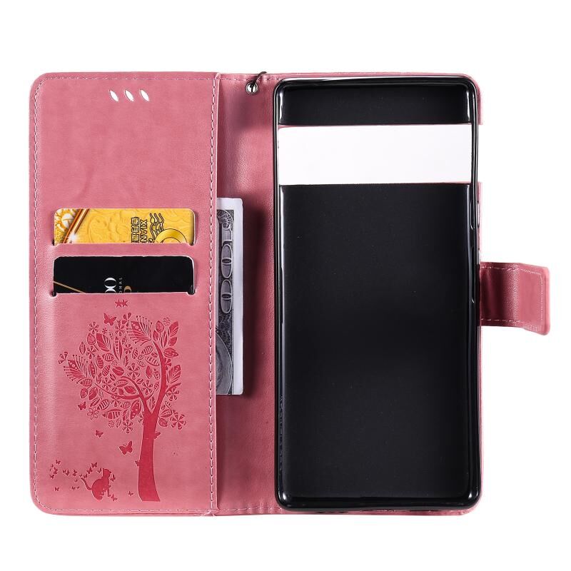 Για το Google Pixel 6 Pro Tree & Cat ανάγλυφο μοτίβο οριζόντια Flip δερμάτινη θήκη με θήκη & υποδοχές για κάρτες & πορτοφόλι & κορδόνι (ροζ)