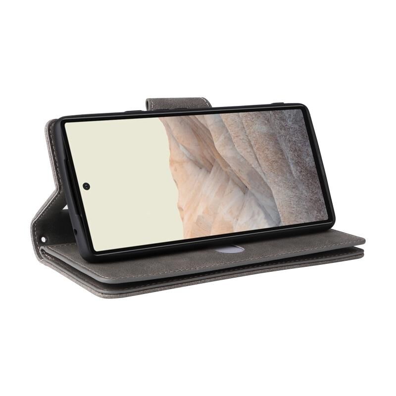 Για το Google Pixel 6 Rivet πόρπη 9 κάρτες τρεις φορές δερμάτινη θήκη τηλεφώνου (γκρι)