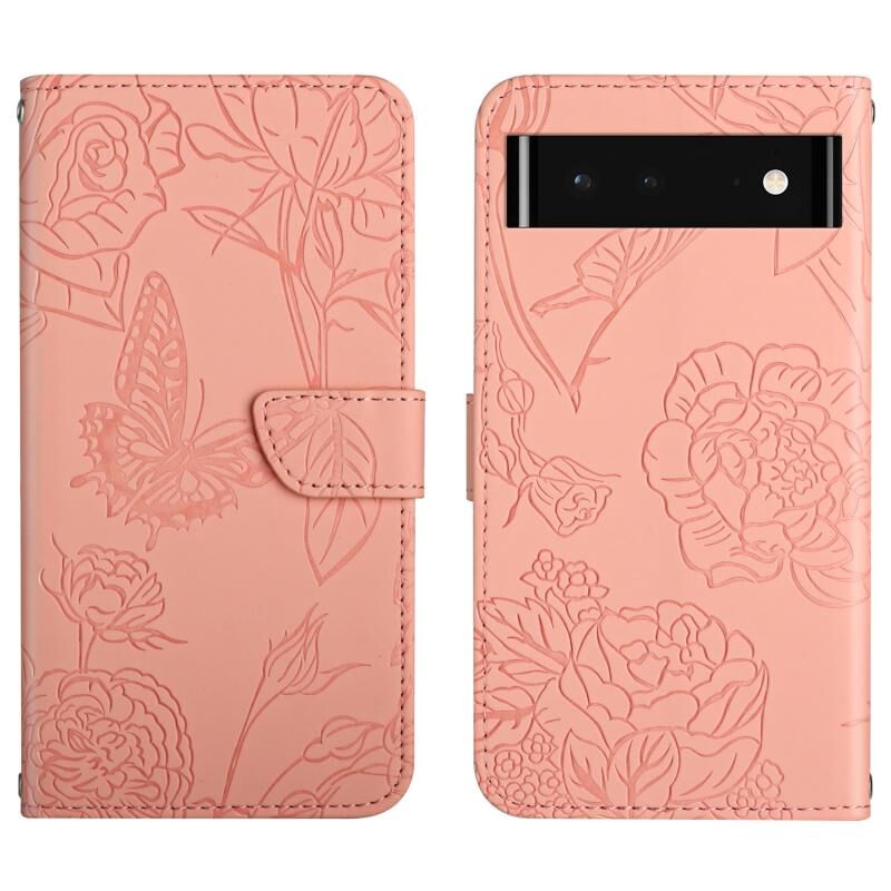 Θήκη τηλεφώνου από ανάγλυφο δέρμα για Google Pixel 6, με σχέδιο πεταλούδας και παιώνιας (Κόκκινο)