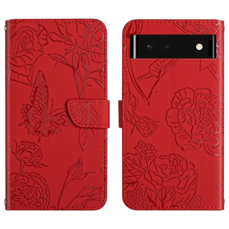 Θήκη τηλεφώνου από ανάγλυφο δέρμα για Google Pixel 6, με σχέδιο πεταλούδας και παιώνιας (Κόκκινο)