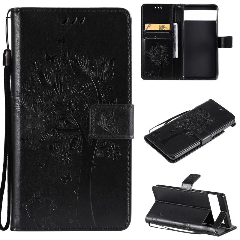 Για το Google Pixel 6 Tree & Cat ανάγλυφο μοτίβο οριζόντια Flip δερμάτινη θήκη με θήκη & υποδοχές για κάρτες & πορτοφόλι & κορδόνι (μαύρο)