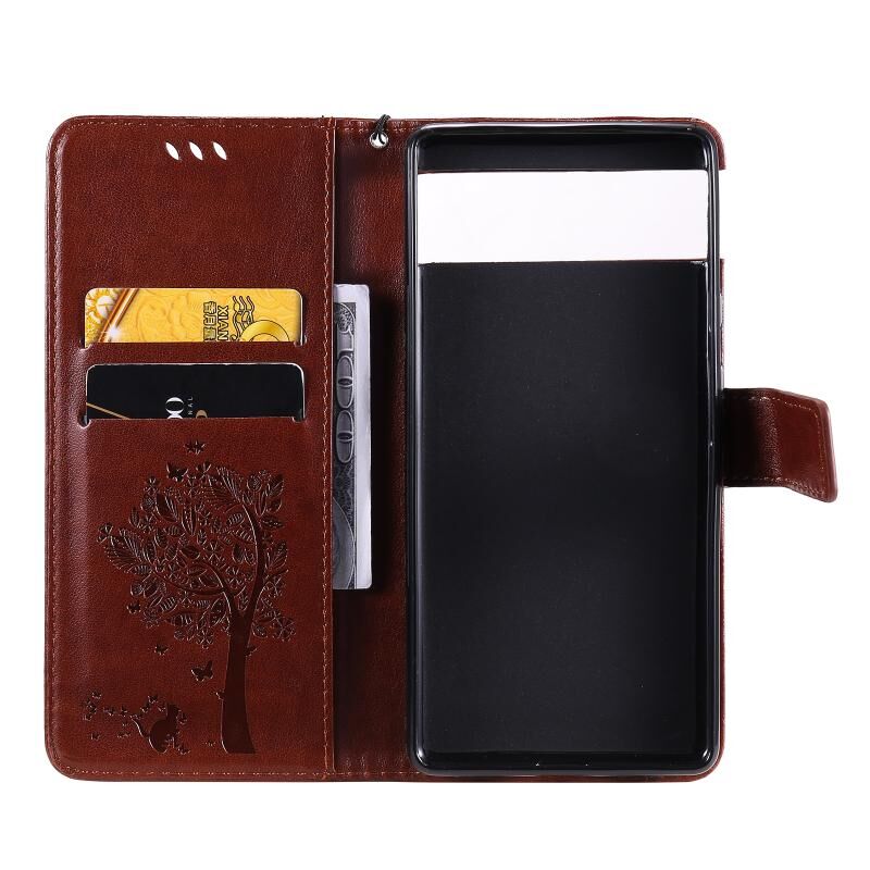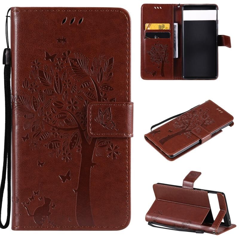 Για το Google Pixel 6 Tree & Cat ανάγλυφο μοτίβο οριζόντια Flip δερμάτινη θήκη με θήκη & υποδοχές για κάρτες & πορτοφόλι & κορδόνι (Καφές)