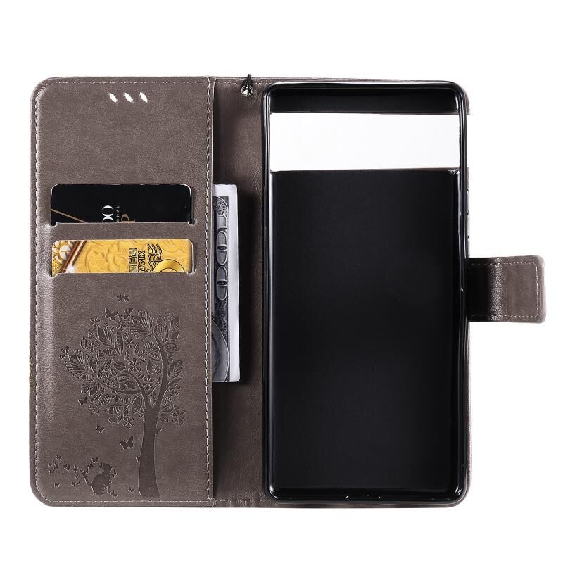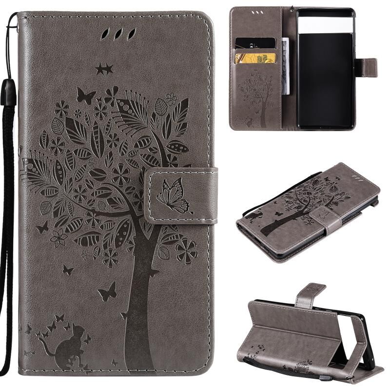 Για το Google Pixel 6 Tree & Cat ανάγλυφο μοτίβο οριζόντια Flip δερμάτινη θήκη με θήκη & υποδοχές για κάρτες & πορτοφόλι & κορδόνι (γκρι)