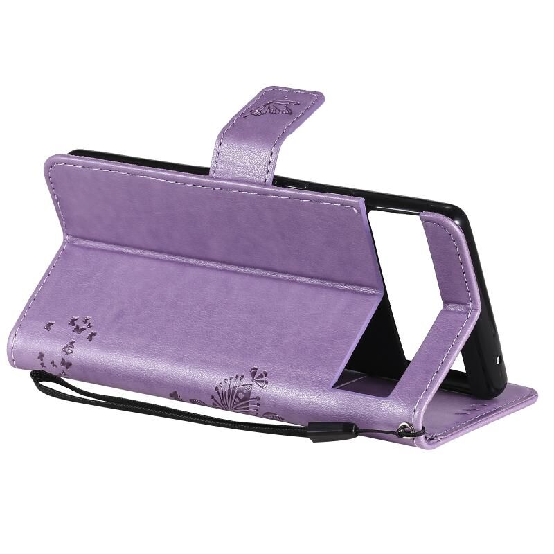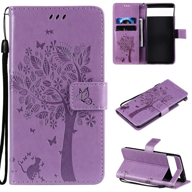 Για το Google Pixel 6 Tree & Cat ανάγλυφο μοτίβο οριζόντια Flip δερμάτινη θήκη με θήκη & υποδοχές για κάρτες & πορτοφόλι & κορδόνι (Light Purple)