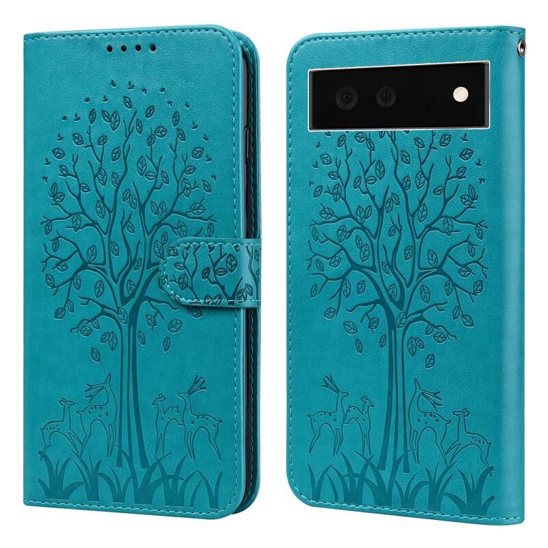 Για το Google Pixel 6 Tree & Deer Pattern Pressed Printing Horizontal Flip Leather Phone Case (μπλε)