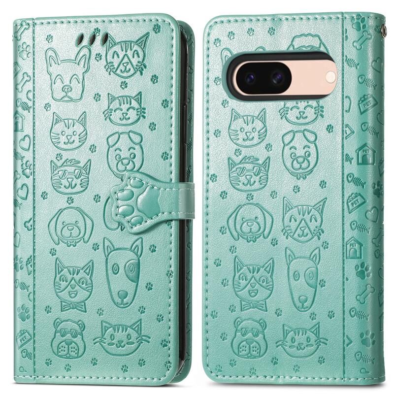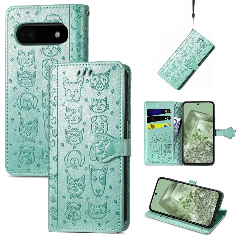For Google Pixel 6a Cat and Dog Embossed Leather Phone Case(Green)