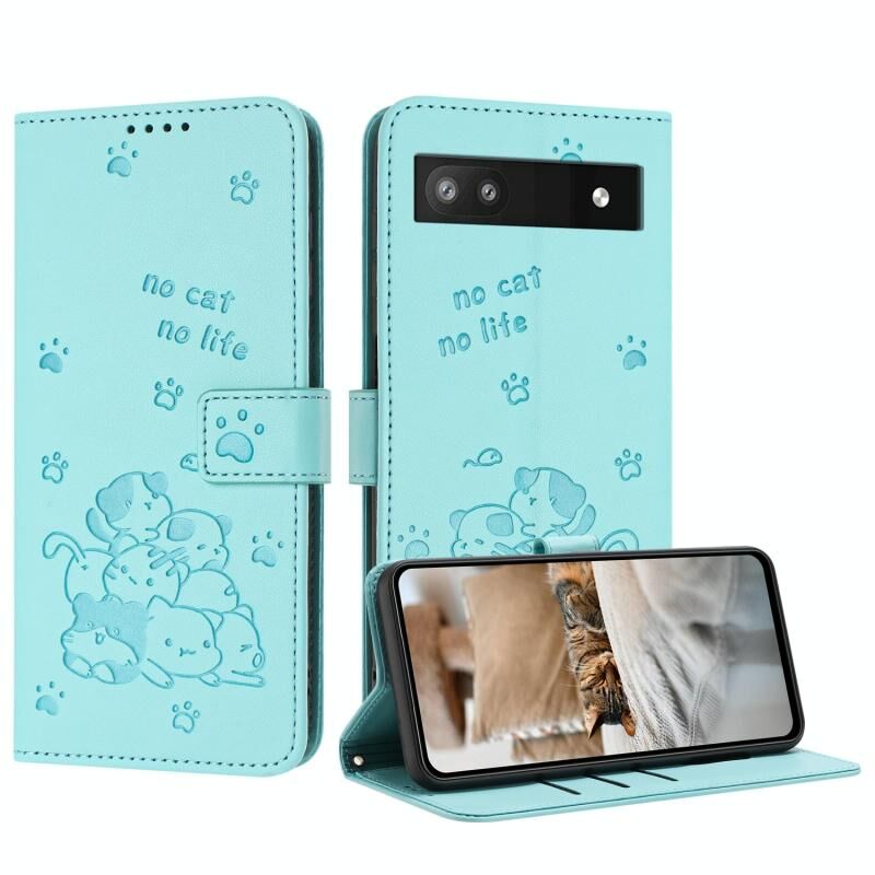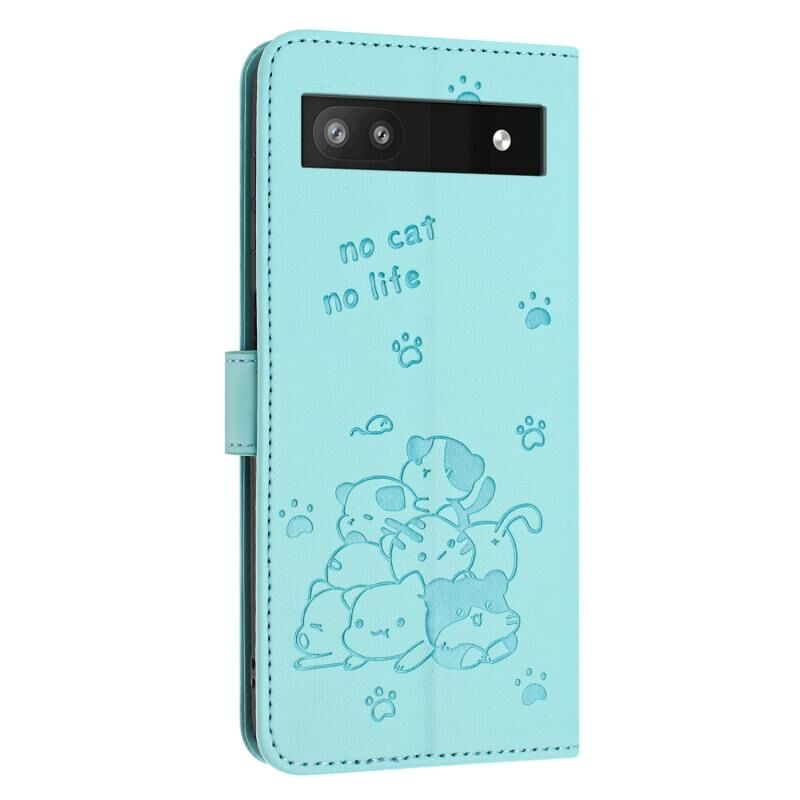 Θήκη δερμάτινη για Google Pixel 6a με ανάγλυφο γατάκι και κορδόνι (Μωβ)