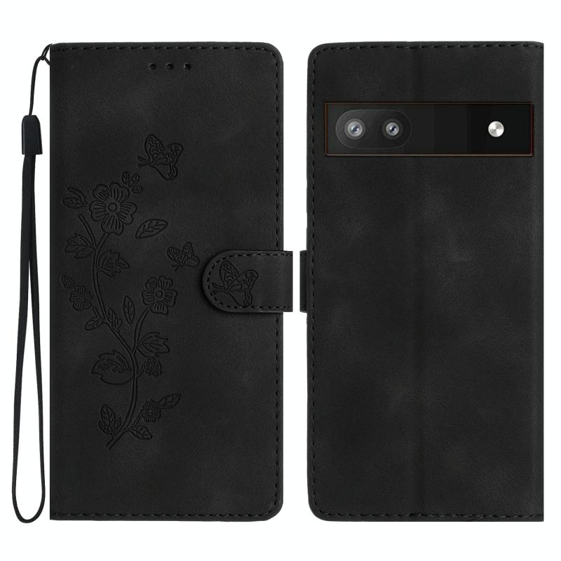 Θήκη τηλεφώνου δερμάτινη με ανάγλυφο σχέδιο λουλουδιών και πεταλούδας για Google Pixel 6a (Μαύρο)