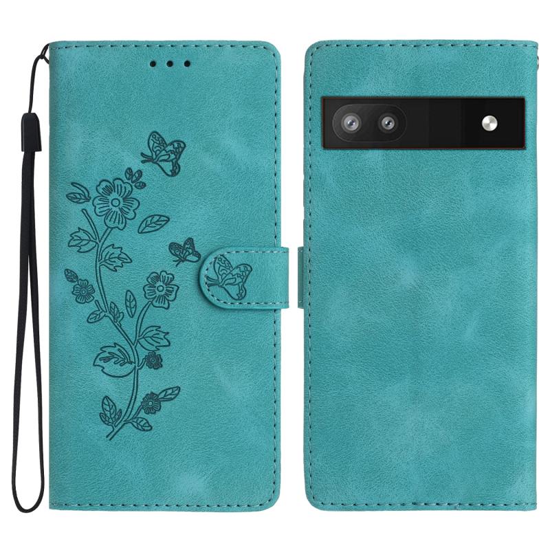 Θήκη τηλεφώνου δερμάτινη με ανάγλυφο σχέδιο λουλουδιών και πεταλούδας για Google Pixel 6a (Μαύρο)