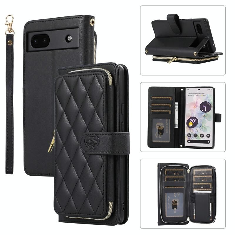 Για το Google Pixel 6a Ρομβοειδές Πλήρης φερμουάρ Πορτοφόλι Δερμάτινη θήκη τηλεφώνου (Μαύρο)