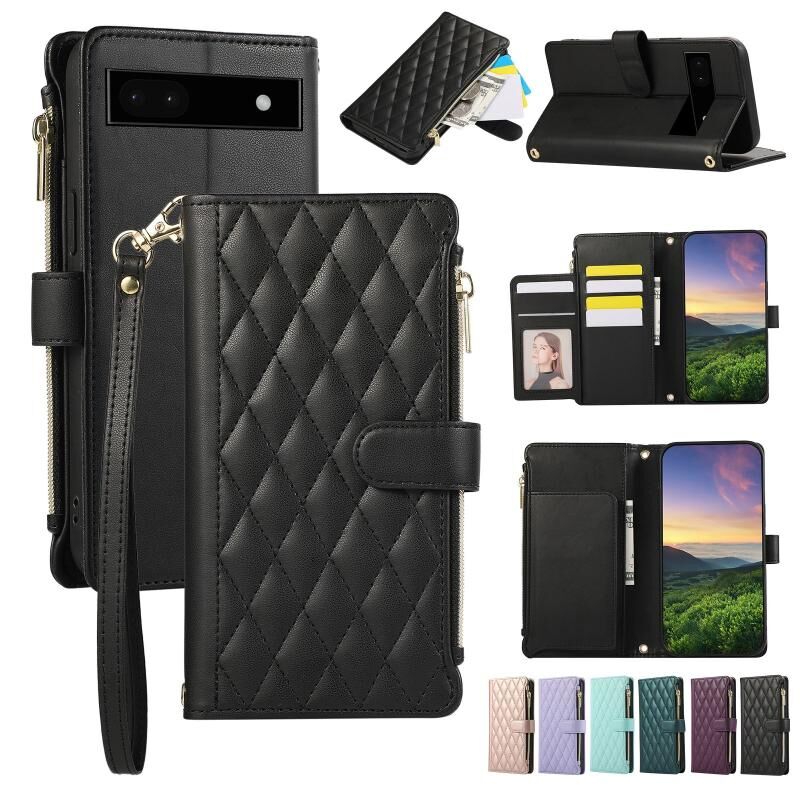 Για το Google Pixel 6a Ρομβοειδές φερμουάρ πορτοφόλι δερμάτινη θήκη τηλεφώνου (Μαύρο)