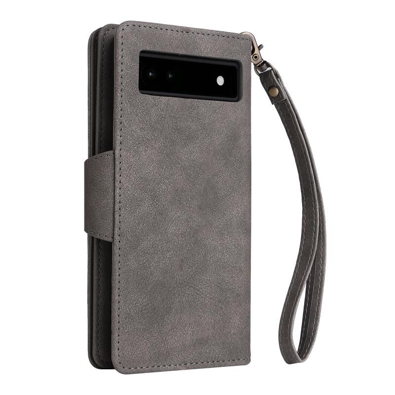 Για το Google Pixel 6a Rivet πόρπη 9 κάρτες τρεις φορές δερμάτινη θήκη τηλεφώνου (γκρι)
