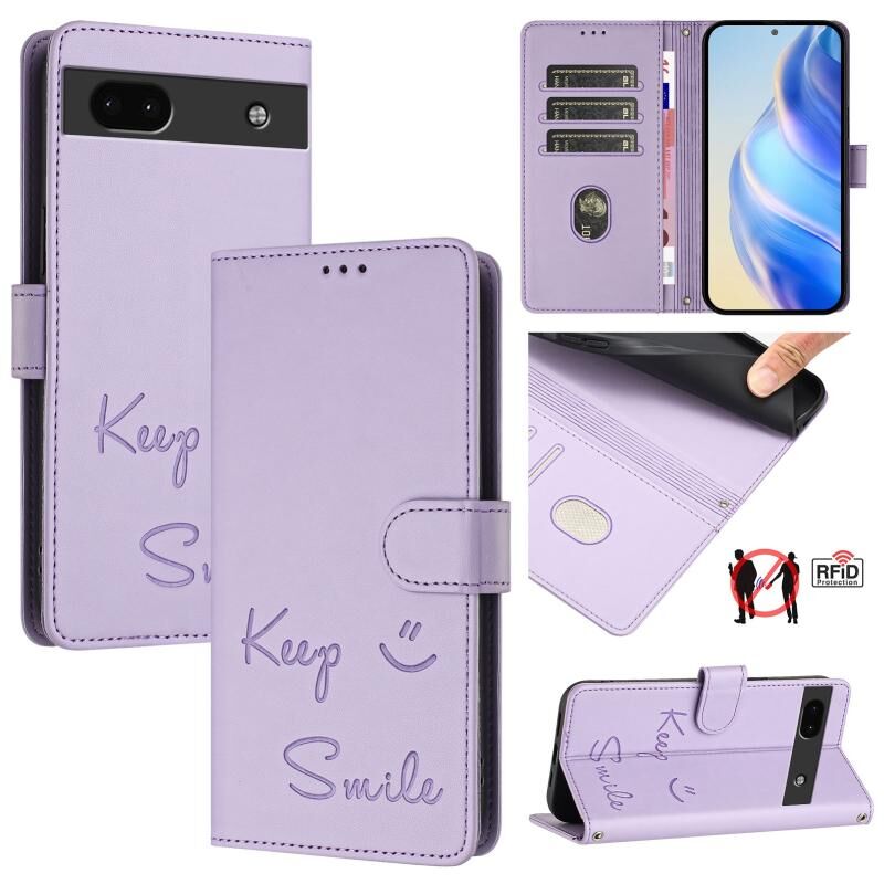 Για το Google Pixel 6a Χαμόγελο ανάγλυφο RFID δερμάτινη θήκη τηλεφώνου (Light Purple)