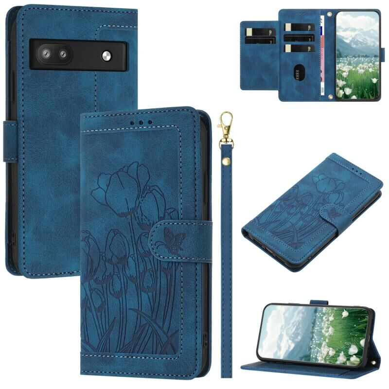 Θήκη τηλεφώνου από δέρμα με ανάγλυφα τουλίπες για Google Pixel 6a με κορδόνι (Ροζ)