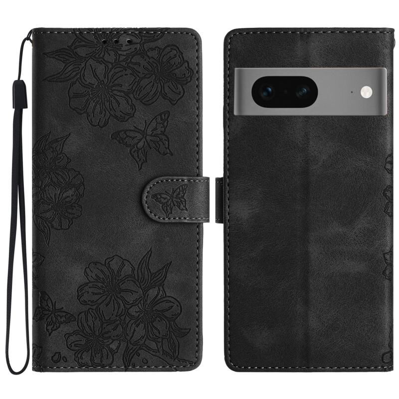 For Google Pixel 7 5G Cherry Blossom Butterfly Skin Feel Embossed PU Phone Case(Black)