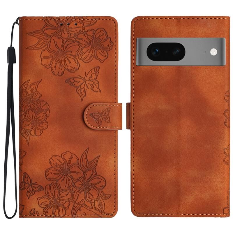 For Google Pixel 7 5G Cherry Blossom Butterfly Skin Feel Embossed PU Phone Case(Brown)