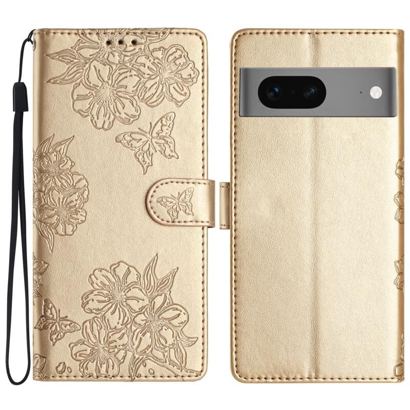 For Google Pixel 7 5G Cherry Blossom Butterfly Skin Feel Embossed PU Phone Case(Gold)