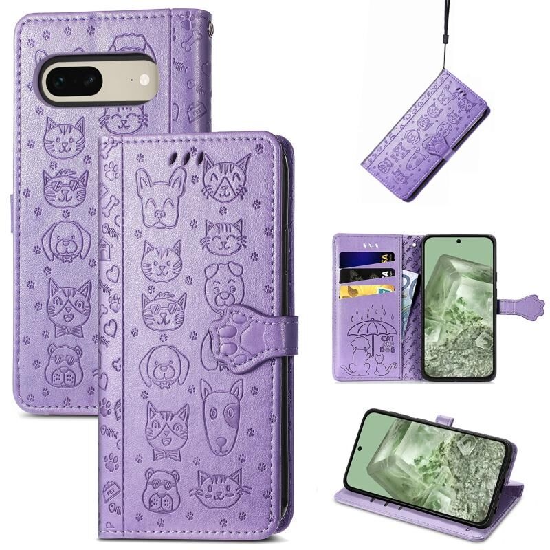For Google Pixel 7 Cat and Dog Embossed Leather Phone Case(Purple)