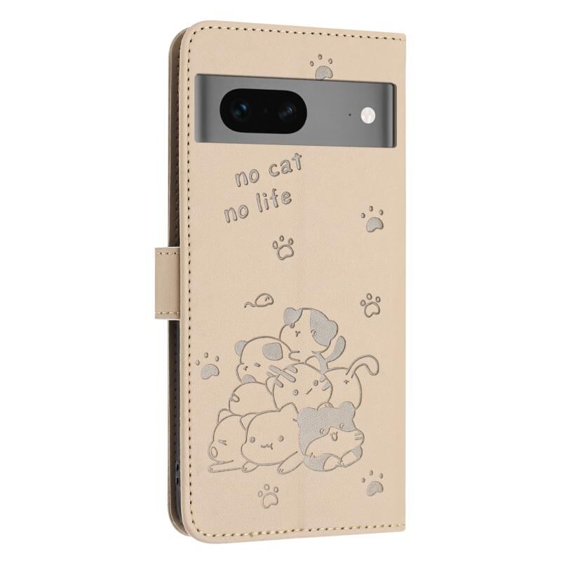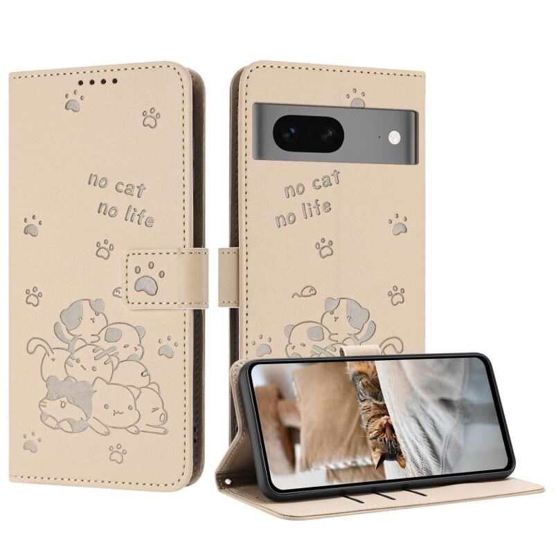 Θήκη δερμάτινη για Google Pixel 7 με ανάγλυφο γατάκι και κορδόνι (Μπεζ)