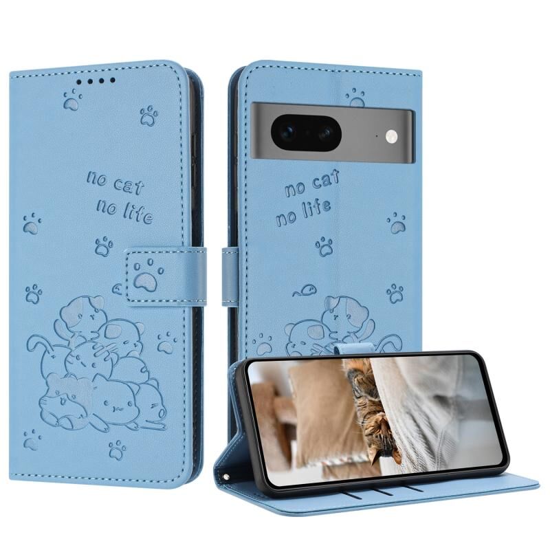 Θήκη δερμάτινη για Google Pixel 7 με ανάγλυφο γατάκι και κορδόνι (Μωβ)