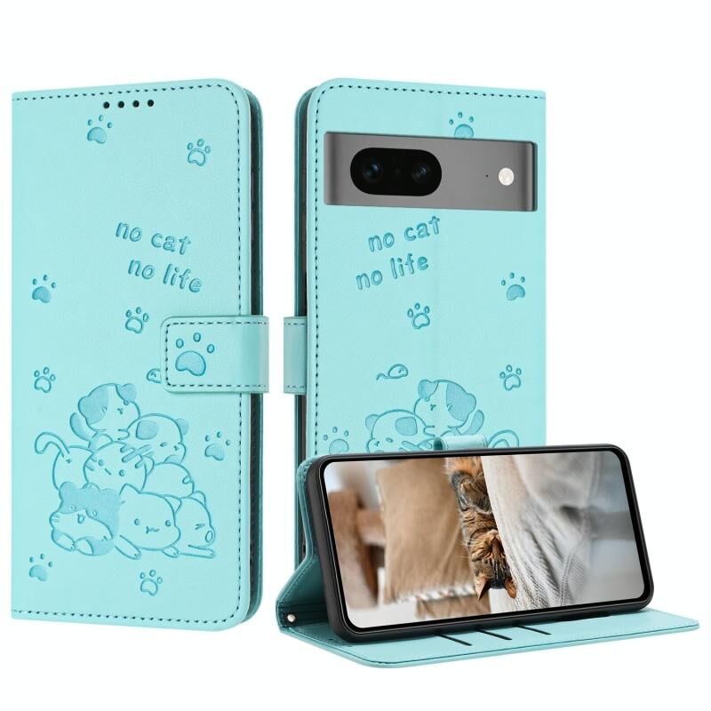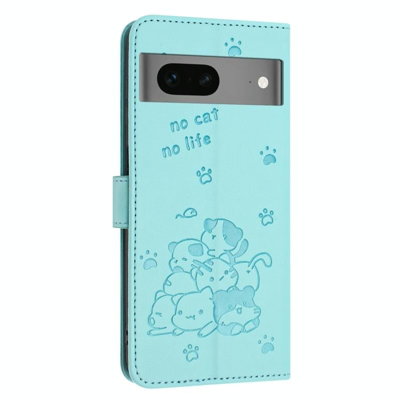 Θήκη δερμάτινη για Google Pixel 7 με ανάγλυφο γατάκι και κορδόνι (Μωβ)