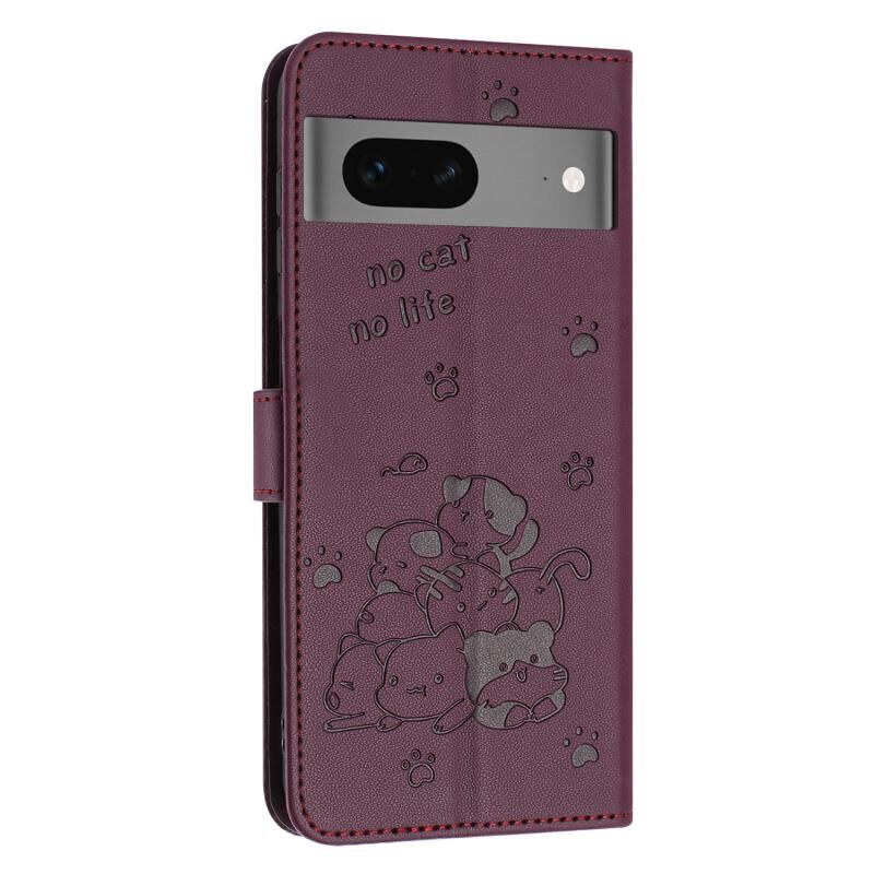 Θήκη δερμάτινη για Google Pixel 7 με ανάγλυφο γατάκι και κορδόνι (Μωβ)