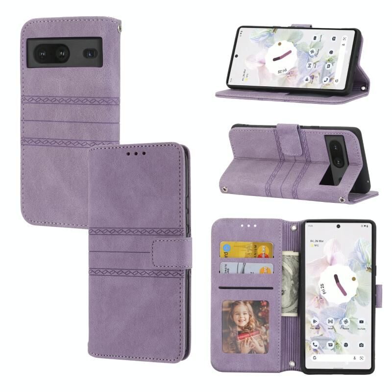 Για Google Pixel 7 ανάγλυφο ριγέ μαγνητική πόρπη οριζόντια Flip τηλέφωνο δερμάτινη θήκη (μωβ)