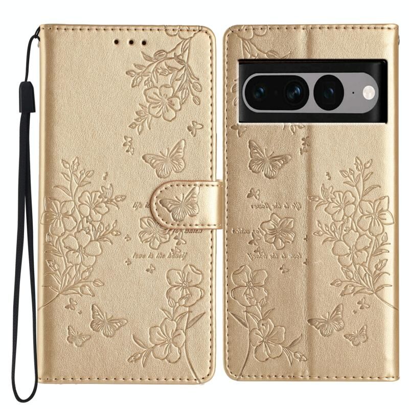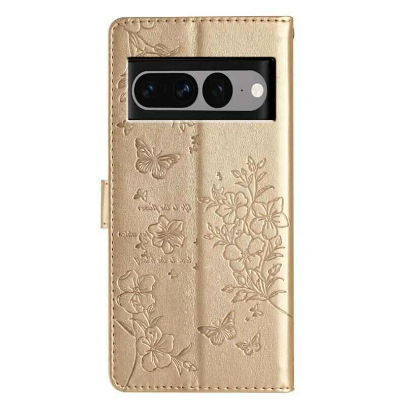 Θήκη τηλεφώνου από δέρμα για Google Pixel 7 Pro 5G, με σχέδια πεταλούδες και λουλούδια (Χρυσό)