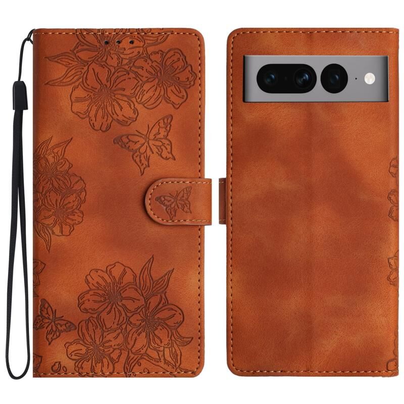 For Google Pixel 7 Pro 5G Cherry Blossom Butterfly Skin Feel Embossed PU Phone Case(Brown)