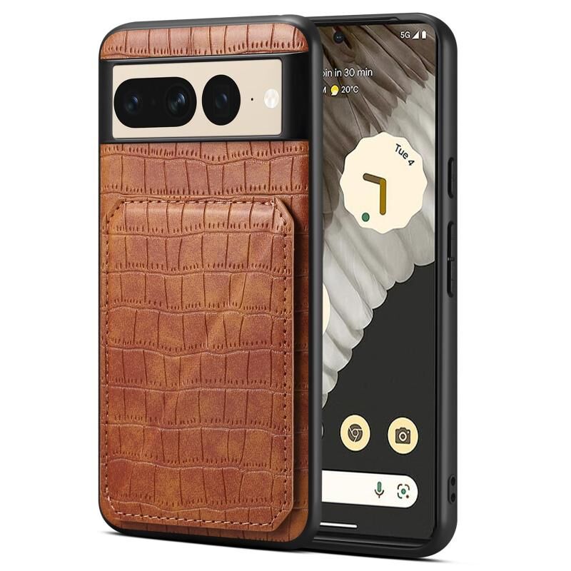 For Google Pixel 7 Pro Denior Crocodile Texture Holder Electroplating Phone Case(Brown) (Denior)