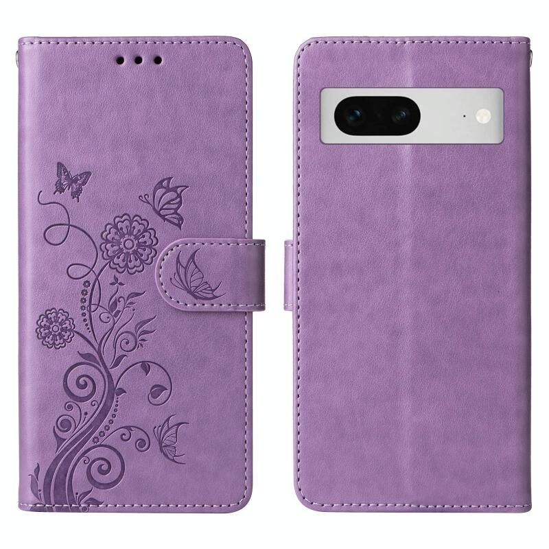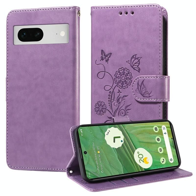 Θήκη τηλεφώνου από δέρμα με ανάγλυφα σχέδια πεταλούδας και λουλουδιών για Google Pixel 7 Pro (Μωβ)