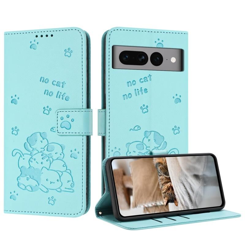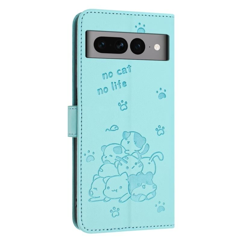 Θήκη δερμάτινη για Google Pixel 7 Pro με ανάγλυφο γατάκι και κορδόνι (Μωβ)
